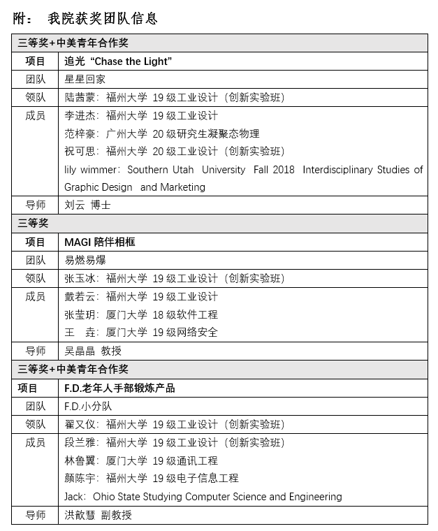 学院工业设计系2019级张玉冰(创新实验班)、陆茜蒙(创新实验班)和翟又仪(创新实验班)三位同学领衔的三个项目“追光”与“MAGI陪伴相框”和“F.D.老年人手部锻炼产品”,分别斩获总决赛三等奖;而肉漫