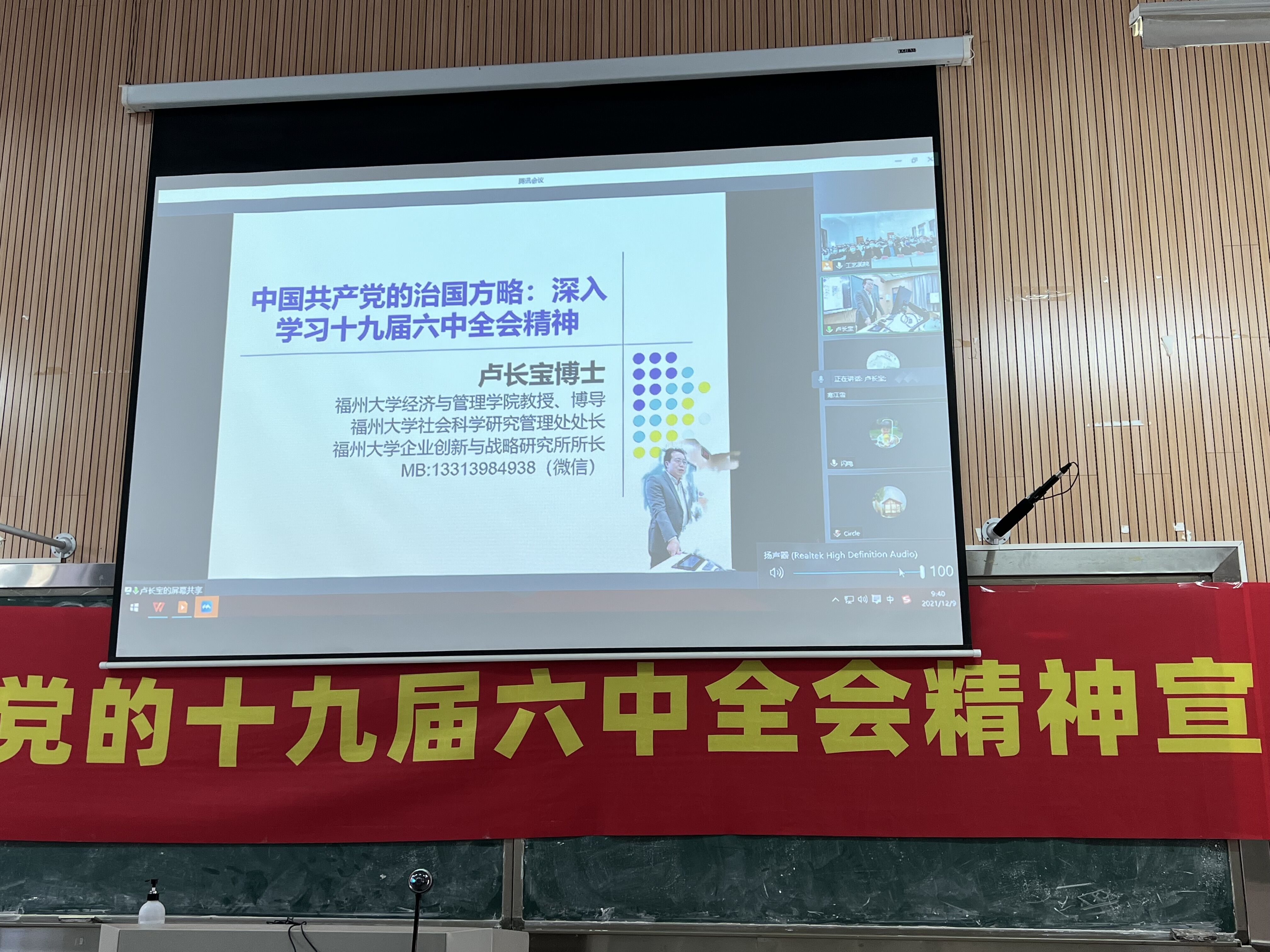 社科处处长卢长宝教授通过线上作题为《中国共产党的治国方略:深入学习十九届六中全会精神》宣讲报告。报告会由学院党委李礼建书记主持,全院教职工200多名在2号楼211教室集中参加了报告会。