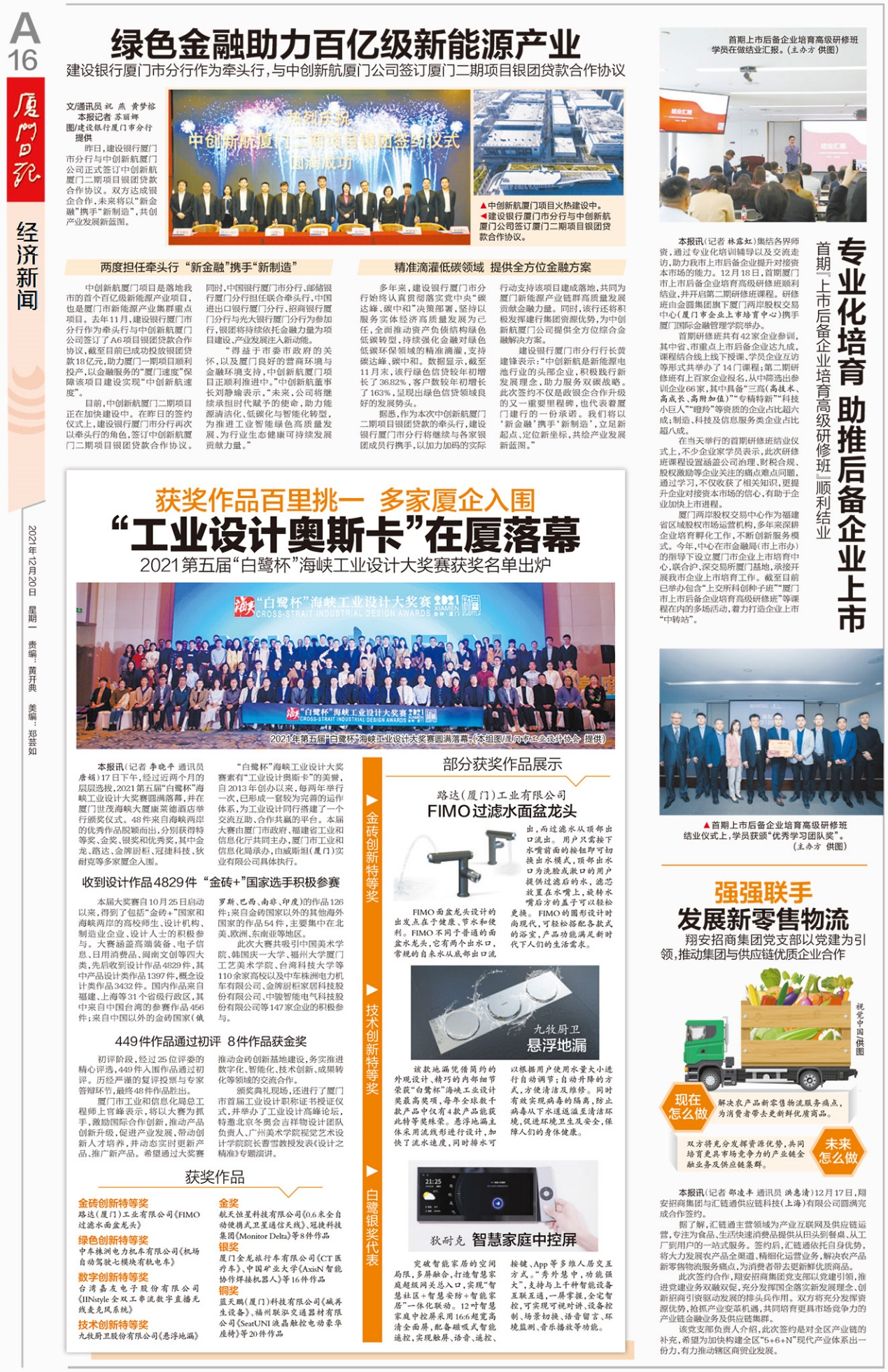 12月17日下午,经过近两个月的层层选拔,2021第五届“白鹭杯”海峡工业设计大奖赛圆满落幕,在厦门世茂海峡大厦康莱德酒店举行颁奖仪式。厦门市工业与信息化局上官峰总工程师、福建省工业和信息化厅生产服务业处林启福处长等领导出席了大赛颁奖仪式。