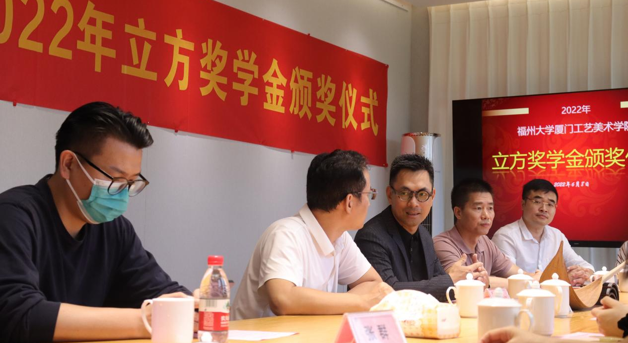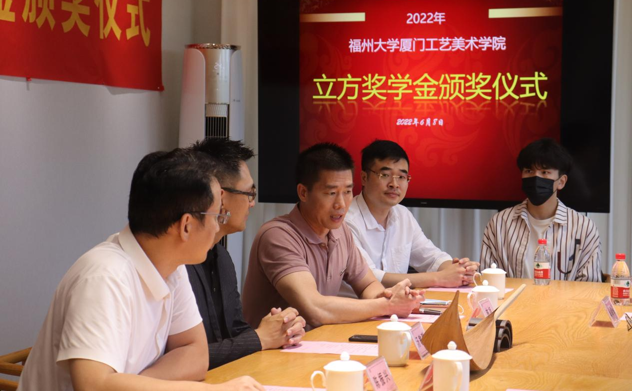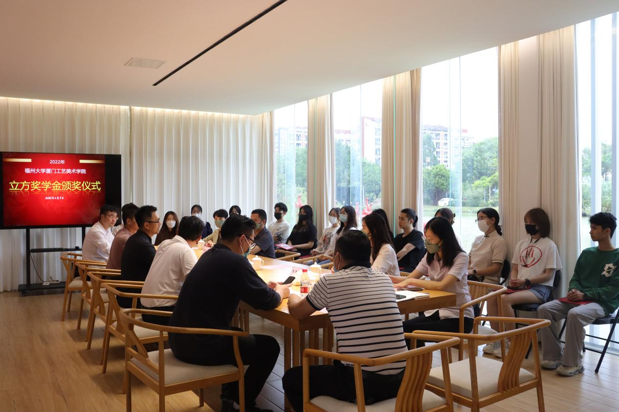 2022年6月8日下午,立方奖学金颁奖仪式在学院书瓦间隆重举行。学院党委林旭副书记,党委委员、团委陈振兴书记,厦门市立方艺品有限公司汤敏聪副总经理,雕塑组张伟、戴越强副经理,设计组李雅琦组长,经理助理王丽丽,人事专员张群,辅导员代表和获奖学生出席了颁奖仪式。