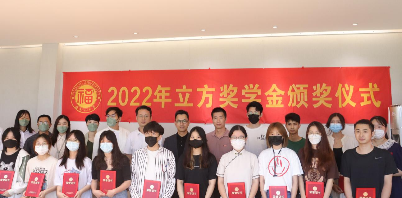 林旭副书记宣读了《关于颁发2021-2022学年立方奖学金的通知》,刘语晨等十四位同学获得立方奖学金。学院领导和厦门立方艺品有限公司领导共同为获奖学生颁发了荣誉证书并合影留念。
