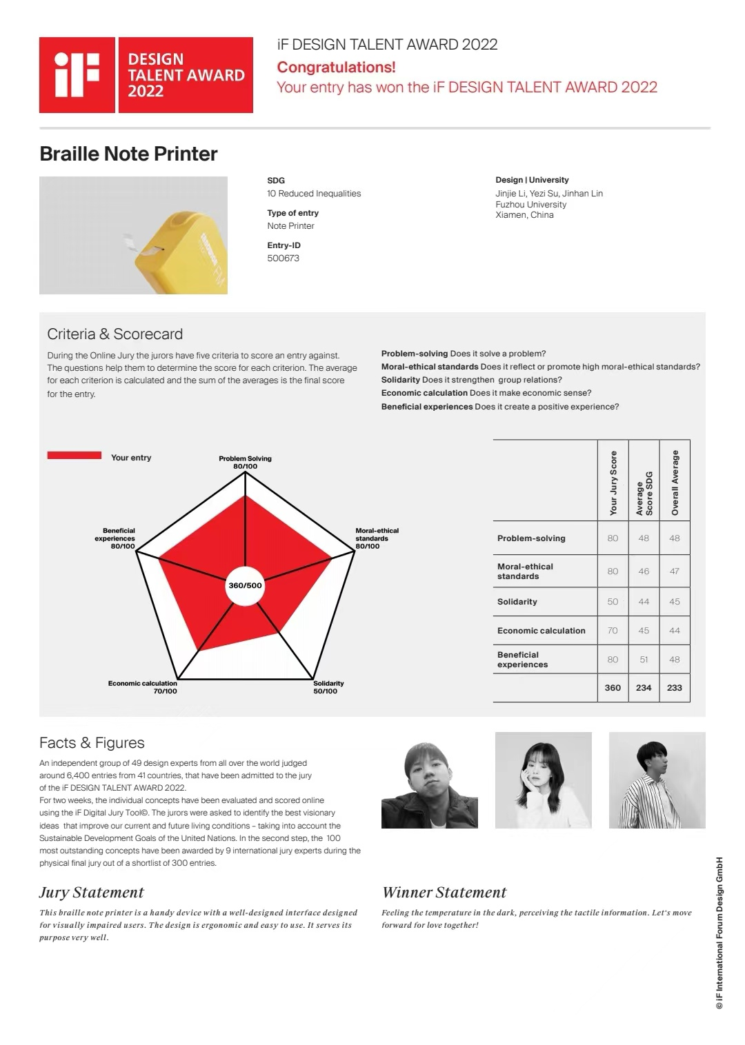 2019级工业设计本科生李进杰、粟叶子、林锦瀚三位同学的设计作品《BRAILLE NOTE PRINTER》(指导老师:郑琳琳)从全球41个国家超过6400件参赛作品中脱颖而出,斩获2022年度iF设计新秀奖(iF DESIGN TALENT AWARD 2022),全球仅85件作品获此殊荣。