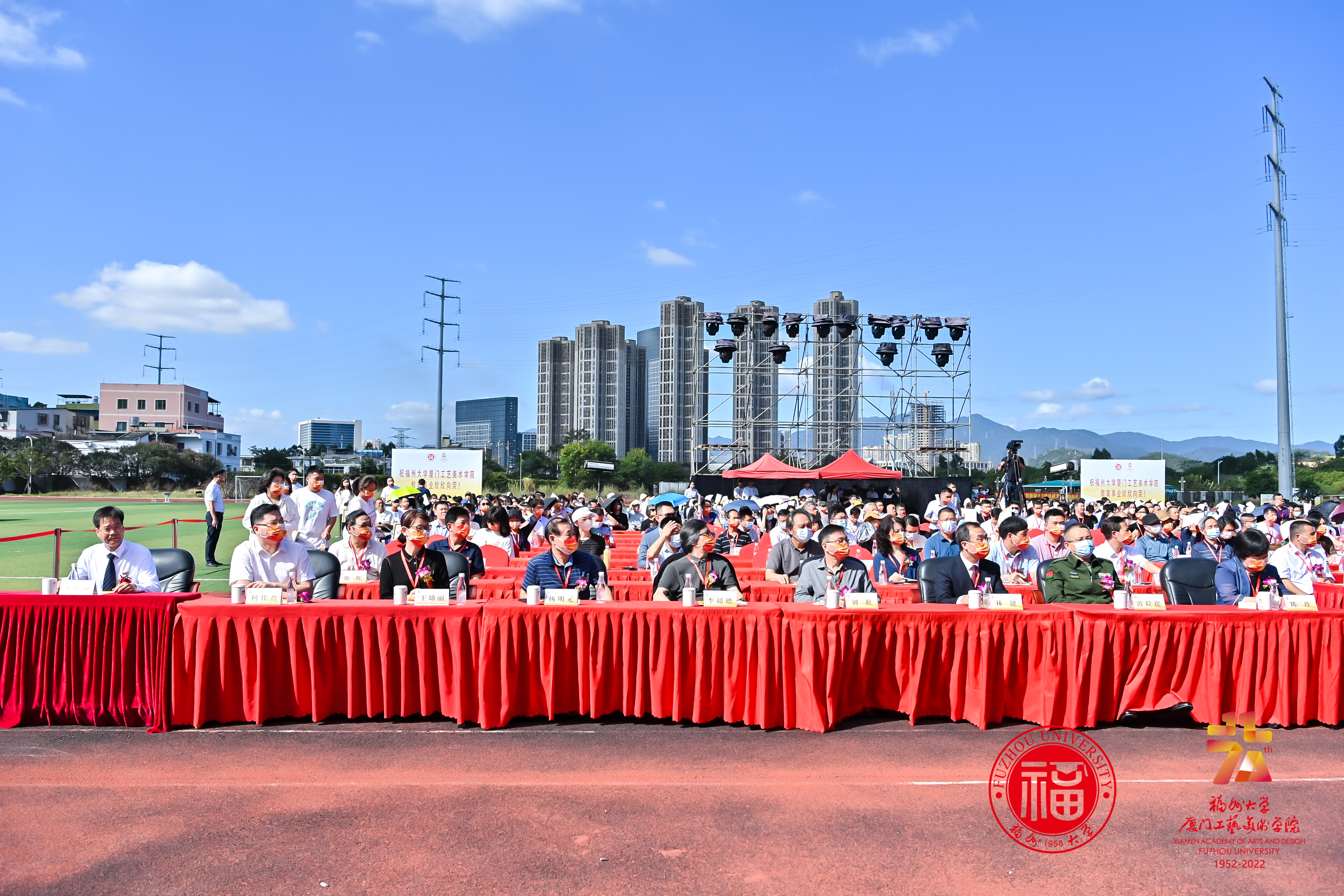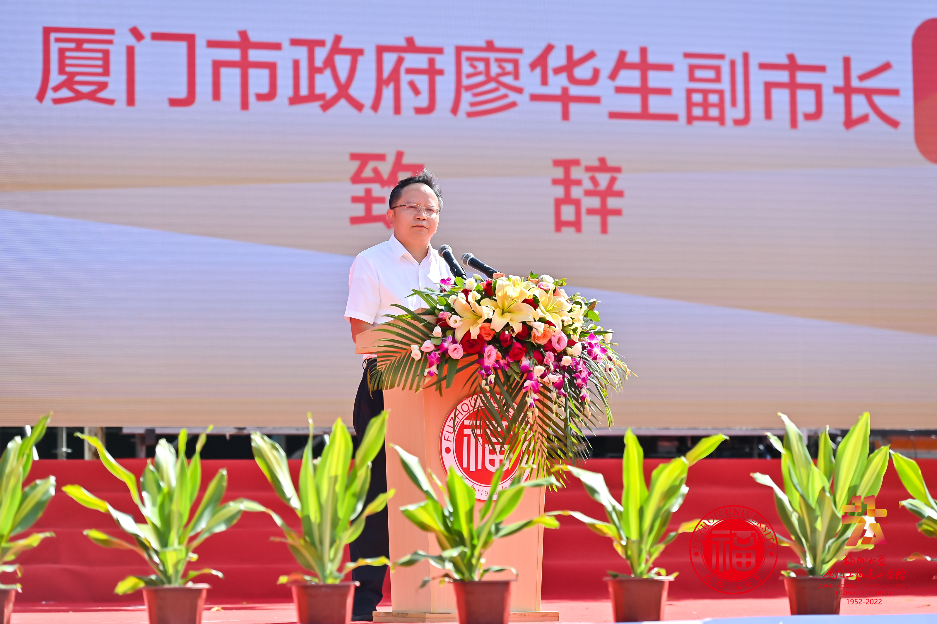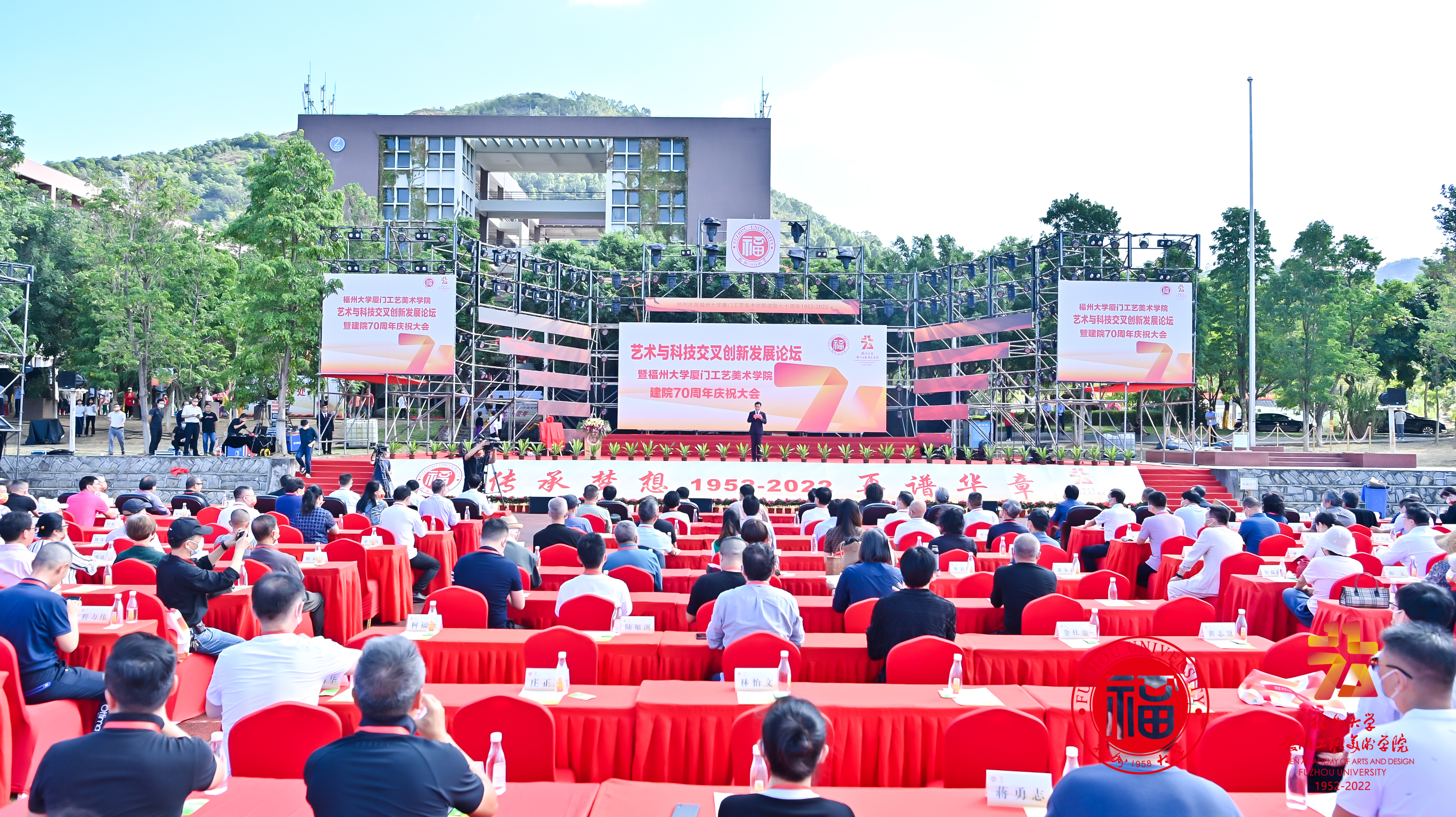 在集美校区隆重举行艺术与科技交叉创新发展论坛暨建院70周年庆祝大会,厦门市政府副市长廖华生、中国民间文艺家协会分党组书记邱运华、福建省文联党组书记、书记处书记、副主席王秋梅、集美区区委书记胡旭彬、福建省文联副主席、书记处书记、省美术家协会主席王来文、中国文联民间文艺艺术中心副主任刘德伟、厦门市教育局局长陈珍、厦门市人大教科文卫委主任齐晓玲、厦门市警备区副司令波拉提、肉漫