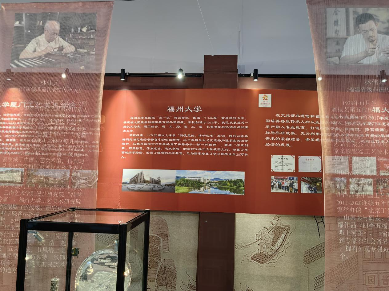非遗研培教师和优秀学员代表参加了此次年会的论坛和展览活动。此次活动,我校共展示了7项非遗作品,其中包括惠安石雕、畲族银器、莆田木雕、德化白瓷、建窑建盏、闽南古为主的6项国家级项目,以及获得2019年全国首创非遗大赛第三名的福建省级非遗项目“泉州锡雕”。同时,展览也作为我校研培工作的汇报展,展示了我校7年以来优秀研培师生的代表性作品。