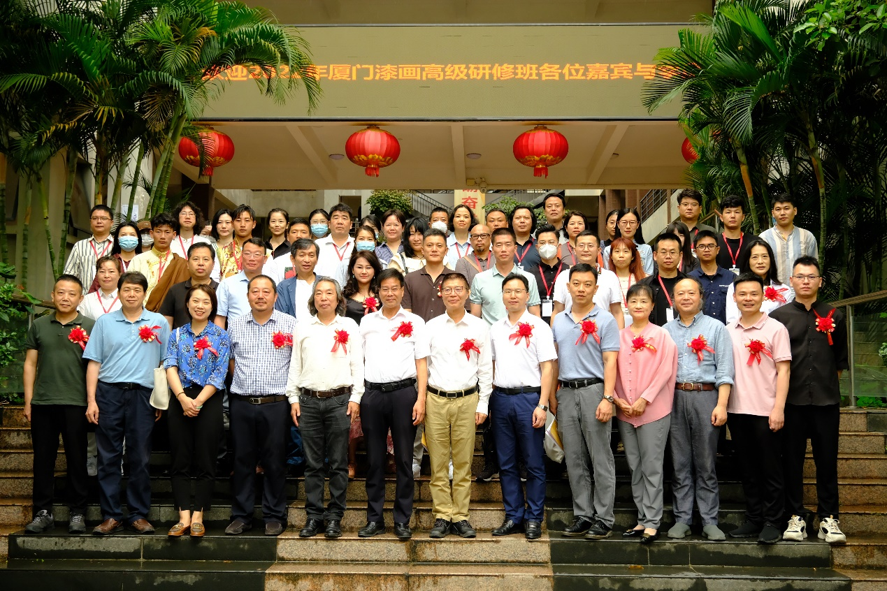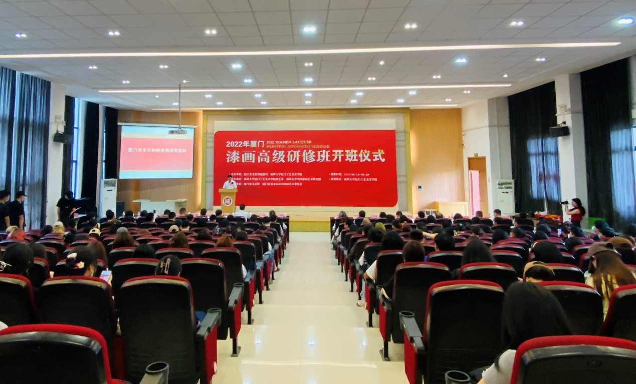 领导及部分师生等200余人。厦门市文化和旅游局原党组成员、二级巡视员、厦门市闽南文化研究会会长叶细致,厦门市文化和旅游局一级调研员严昌祥,中国美术家协会漆画艺委会主任、厦门大学教授陈金华,集美大学美术与设计学院院长陈其端,厦门市文化和旅游局公共服务处(非物质文化遗产处)处长郑敏慧,厦门市文化和旅游局公共服务处(非物质文化遗产处)三级调研员邱华琳,厦门市美术馆书记、馆长陈娟,厦门市美术馆副馆长陈鑫等领导嘉宾出席开班仪式,开班仪式由该项目负责人中国美协漆画艺委会委员、肉漫