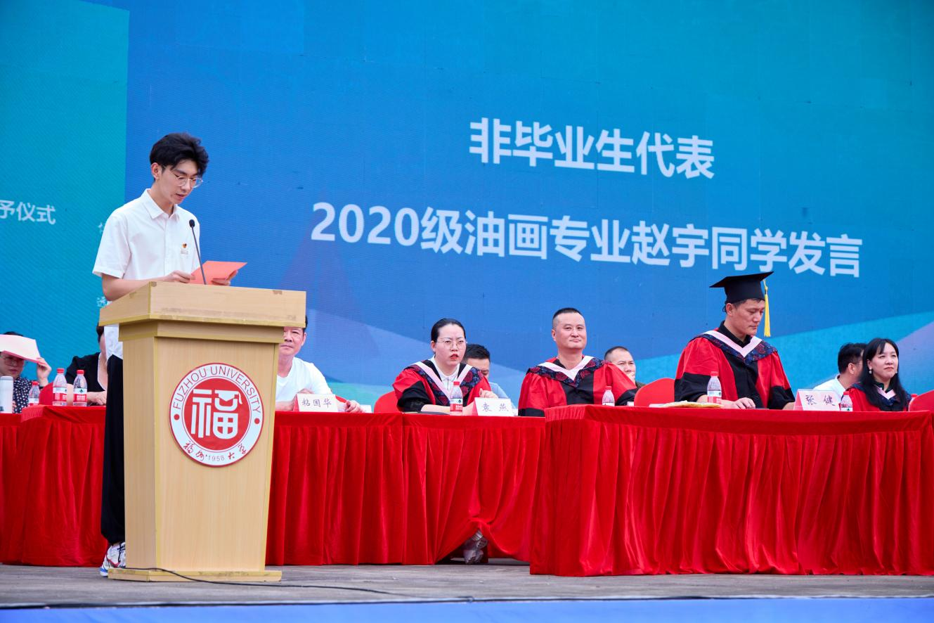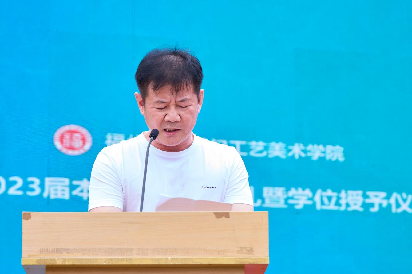 接着,在校生代表、毕业生代表、学生家长代表、校友代表、教师代表依次发言。赵宇同学代表全体在校生向学长学姐们送上最真诚的祝愿,祝福大家前程似锦,一路高歌,开启崭新的人生篇章。毕业生代表李凌晴同学代表学院2023届全体本科毕业生向辛勤培育、悉心教养的领导、老师们表达衷心的感谢和敬意。学生家长代表颜少珠女士向学院和老师们表示感谢,祝愿学院越办越好,桃李满天下!校友代表三明校友会会长(84级绘画)粘国华先生,分享了自己人生经历,希望学弟学妹们除了坚持做自己喜欢的事与保持专注做任何事之外,还要懂得感恩是人生的支点。教师代表校“旗山学者”顾琰博士肯定了同学们在学业上的辛勤付出,希望同学们格物致知、止于至善,在新的时代勇往直前。