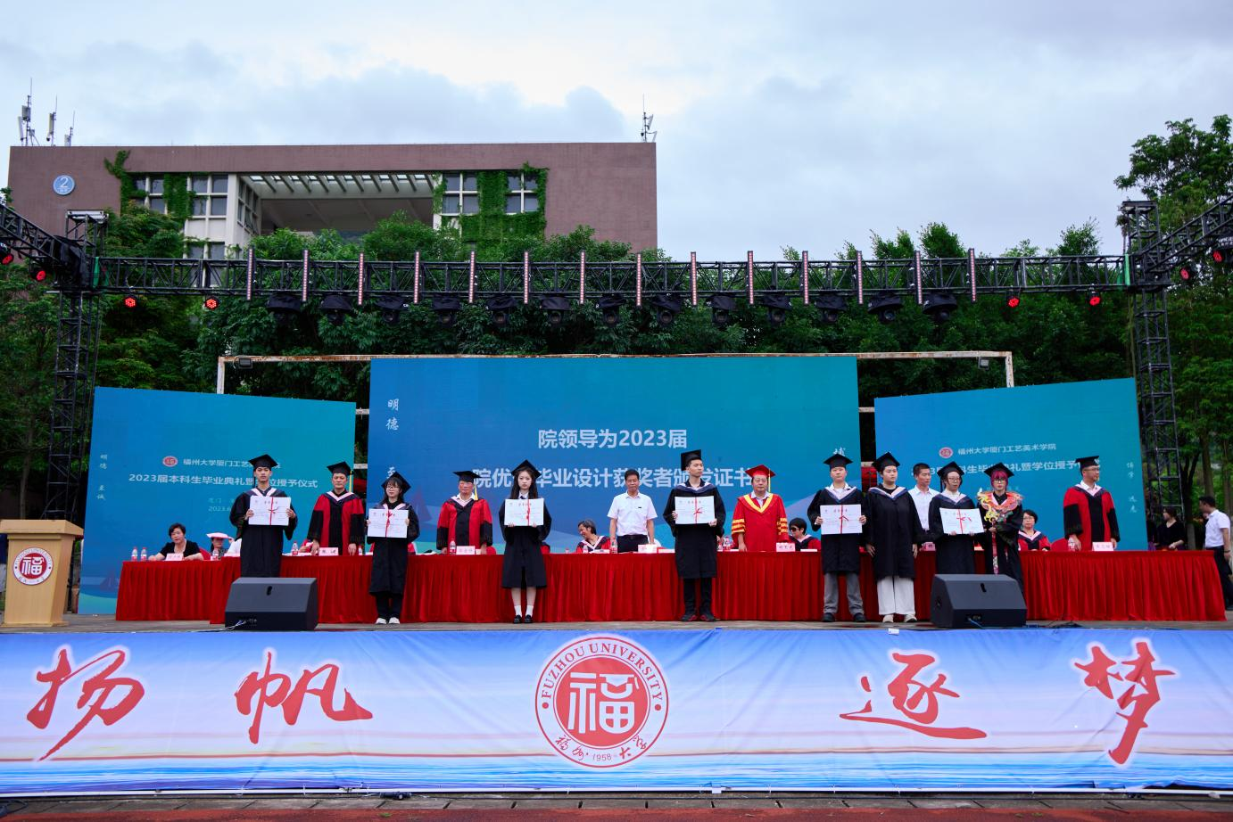 毕业典礼在全体合唱国歌中拉开序幕。党委林金强副书记宣读优秀毕业生表彰决定、2023届毕业生校友联络员和校友召集人名单,张健副院长宣读学院优秀毕业设计学生名单。院领导为校优秀毕业生、2023届校友联络员和校友召集人以及2023届学院优秀毕业设计获奖者颁发证书。
