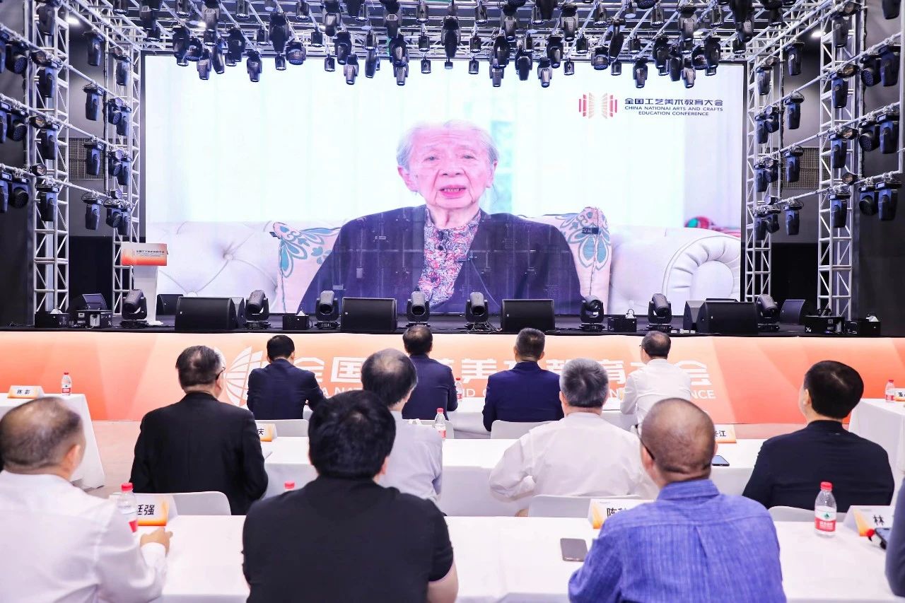 中国工艺美术学会名誉会长常沙娜先生以视频形式为大会致辞,她指出,这是工艺美术专业领域首次全国性的教育大会,展赛汇聚全国多所高等院校工艺美术专业非常优质、创新、创意的作品,很好地展现了全国院校当代工艺美术创意设计的实力,开展全国院校之间工艺美术专业的学科交流,我们要把握住时代发展的机遇,暨守正有创新,传承我国民族传统的特色,提升中国工艺美术教育水平。她认为,首届全国工艺美术教育大会为我们培养新时代工艺美术的高质量人才,提供了一个非常高水平的交流平台,这次教育大会将是一场影响深远发展的盛会,希望大家共同努力,推动中国工艺美术教育的创新与发展,让中国工艺美术在新的时代中焕发出更加绚丽的光彩。