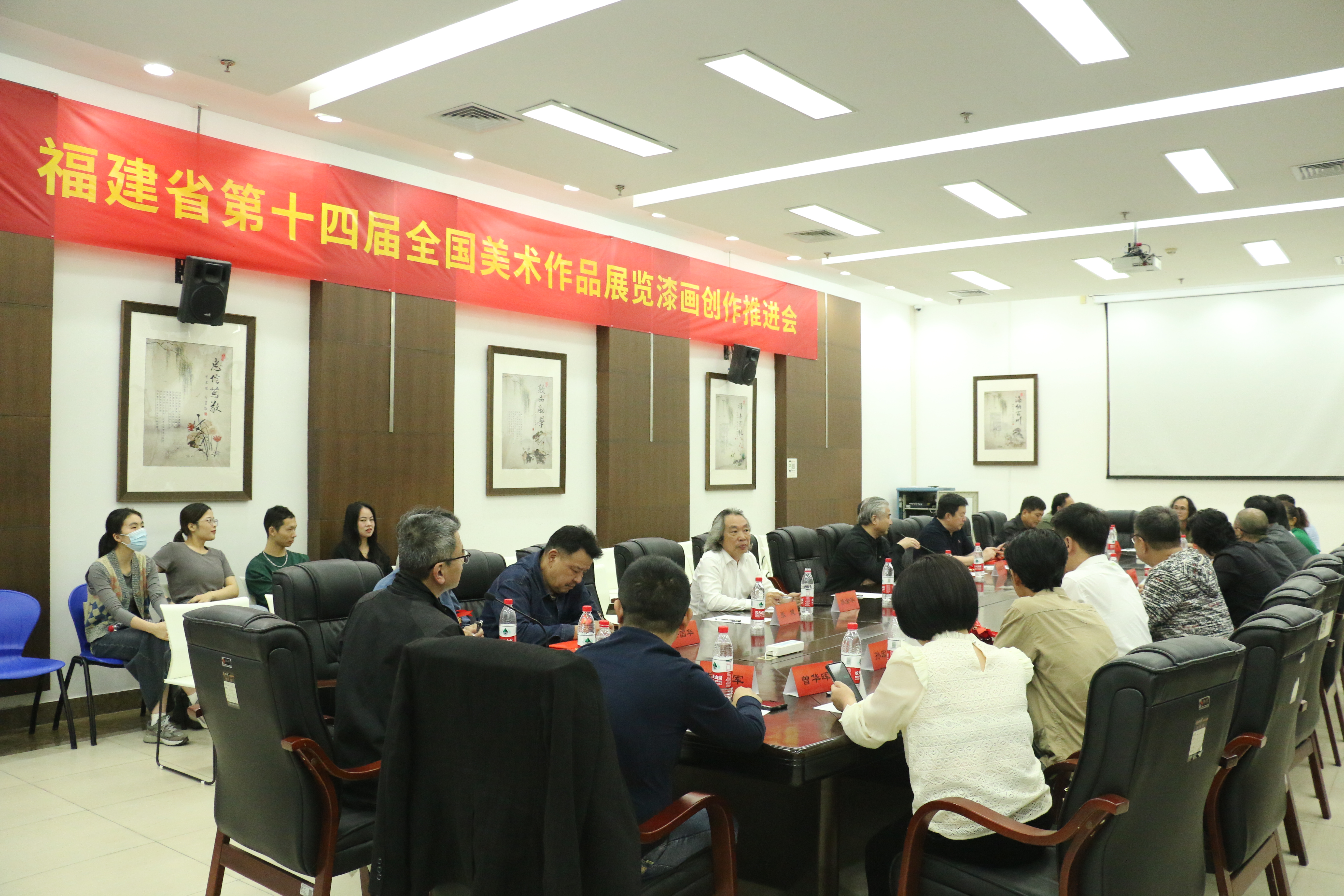 苏国伟、福建师范大学美术学院胡新地、华侨大学美术学院江文佳、闽江学院美术学院金晖、泉州师范学院美术与设计学院卫军、集美大学美术学院曾华晖、福州地区江书荣等高校漆画学科负责人及地区漆画家代表,分别介绍各单位、地区备战第十四届全国美展漆画创作情况。参会嘉宾中国美协漆画艺委会程向君、汤志义、王向阳、张泽国、金晖、苏星等教授分别谈了关于全国美展漆画创作的相关情况,并对福建漆画所取得的成绩和在中国漆画发展历程中的引领推动作用予以高度肯定。