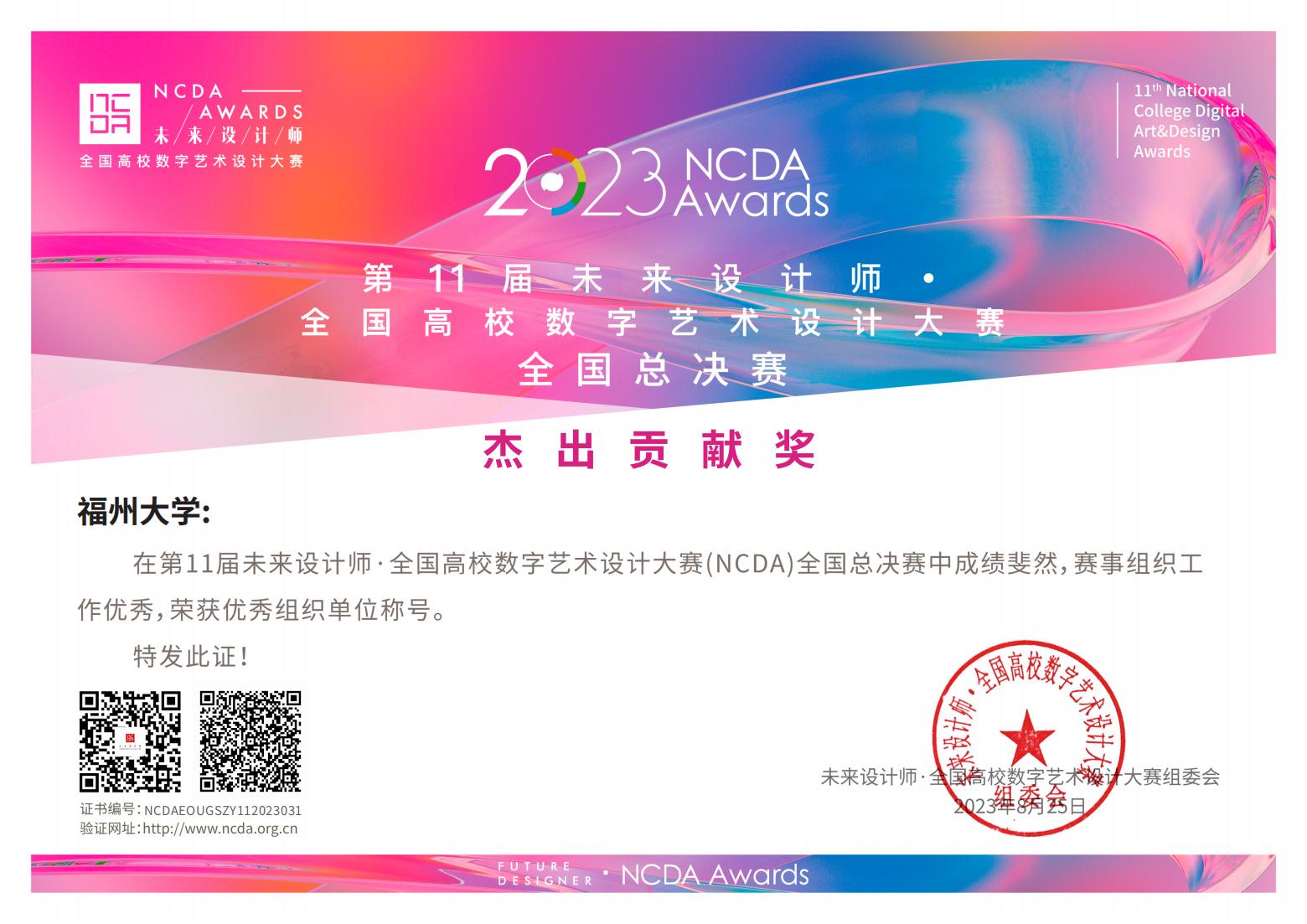 获奖作品涵盖了动画设计、游戏设计、表情包设计、数字影像、交互设计、人居环境设计、产品造型设计、视觉传达设计、时尚设计、数字摄影等多样类别,体现了全院师生优秀的综合设计能力与办学特色。学院黄晓瑜、袁野、刘丽倩等3位老师获得全国赛“优秀组织教师”表彰,田启龙、翟宇、袁野、宋晓毅、刘丽倩、黄晓瑜等6位老师获得全国赛“优秀指导教师”表彰,福州大学荣获全国总决赛“杰出贡献奖”及福建赛区“优秀组织”奖单位。