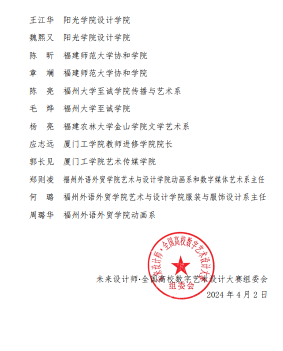 全国高校数字艺术设计大赛组委会郭清胜秘书长宣布2024第12届未来设计师·全国高校数字艺术设计大赛福建赛区组委会正式成立(组委会名单详见附录)。