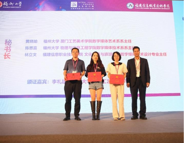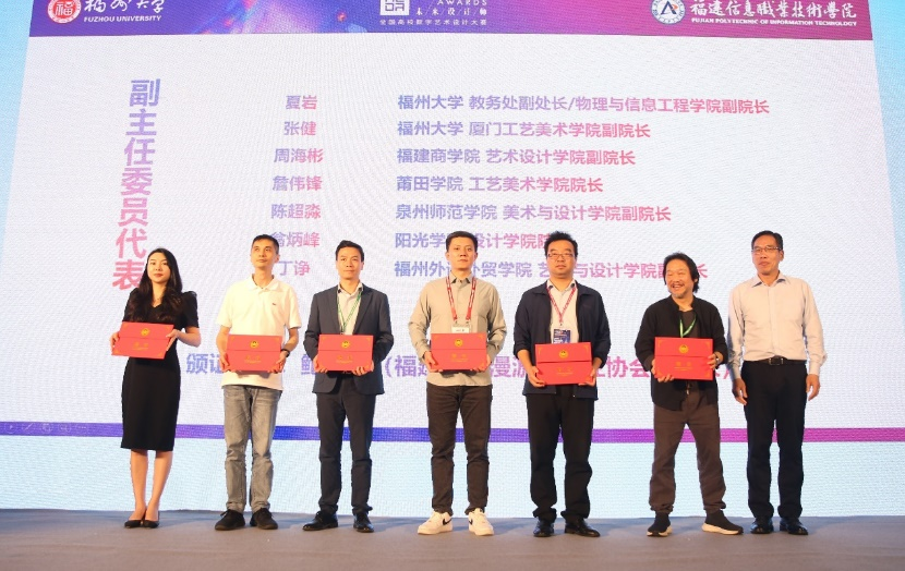 最后,由全国高校数字艺术设计大赛组委会郭清胜秘书长颁发福建赛区组委会主任委员代表聘书。由福建赛区组委会主任委员,福建省动漫游戏行业协会秘书长鲍永芳、福建信息职业技术学院副校长柏定国颁发福建赛区副主任委员代表聘书。
