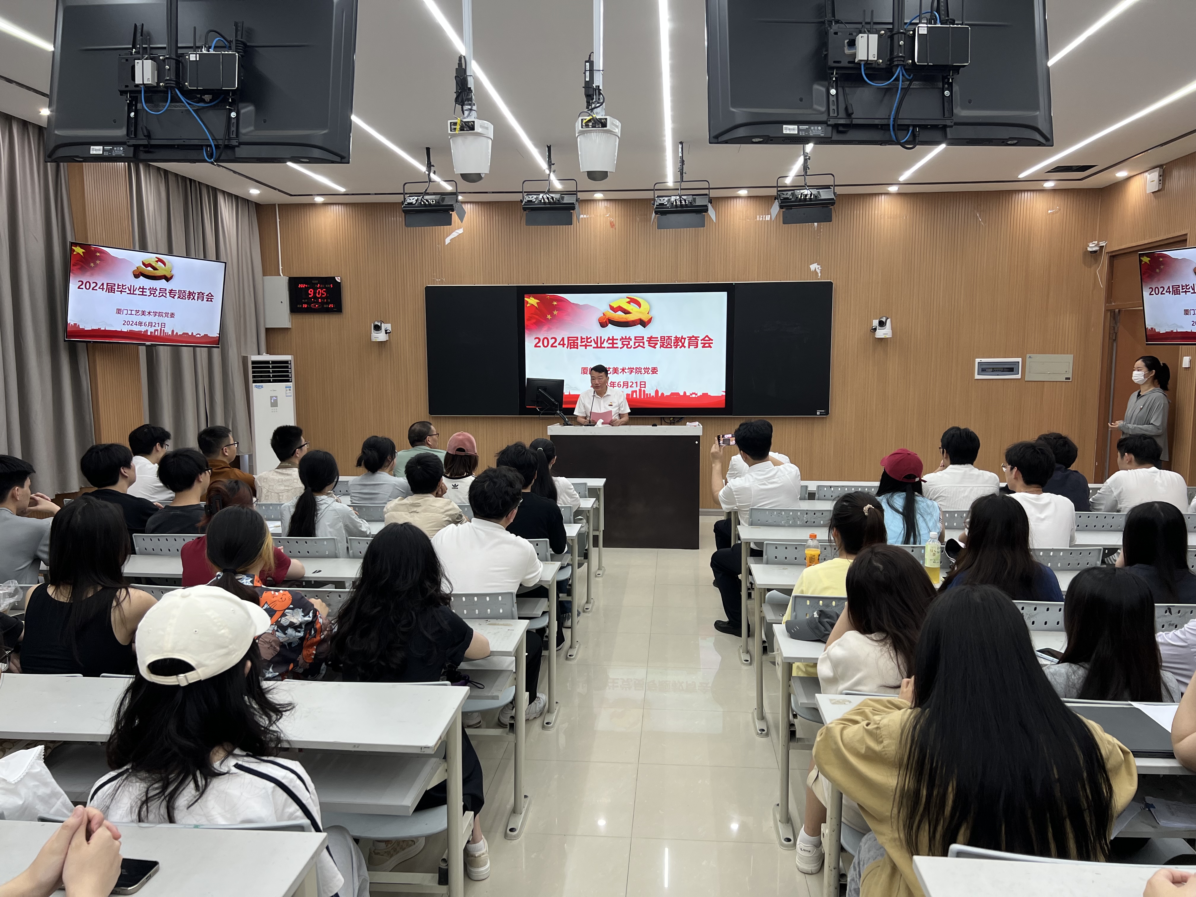2024年6月21日上午,厦门工艺美术学院党委在2号楼208教室召开2024届毕业生党员教育专题会。学院党委林金强副书记主持会议,学院党委委员、团委书记、学生科长陈振兴、党委组织员林瑞来和部分辅导员老师及学院毕业生党员等参加会议。