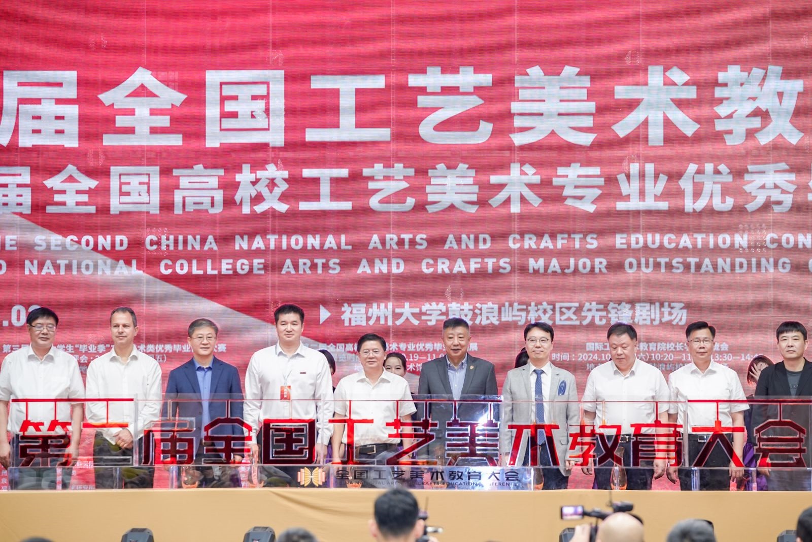 副校长王心晨,中共厦门市委宣传部常务副部长、一级巡视员上官军,中国工艺美术学会副理事长、教育工作委员会主任、清华大学美术学院院长马赛,鼓浪屿管委会主任林跃峰,四川美术学院副校长段胜峰,英国皇家艺术学院原副校长Naren Barfield,韩国首尔大学美术学院副院长闵复基,厦门广电集团党委副书记、总裁戴志望,共同启动“‘第二届全国工艺美术教育大会’暨‘第二届全国高校工艺美术专业优秀毕业作品展’”。