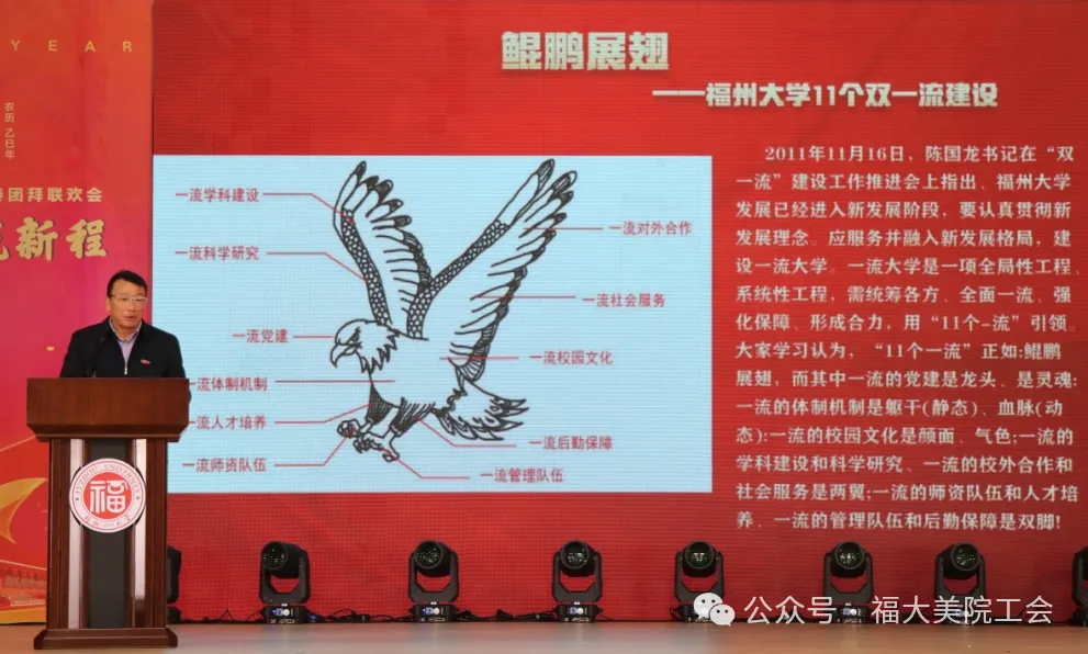 林金强书记主持期末教职工大会,首先通报新入职教职员工及新提拔干部名单,随后以《凝心聚力,争创一流,谱写美院高质量发展的新篇章》为主题的党课,用“鲲鹏展翅”的图像生动地诠释11个一流,让教职员工牢记学校“十一个一流”建设的目标及路径。最后,向广大教职员工及家属致以新春的祝福!