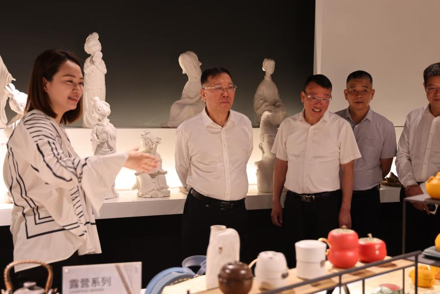 82级陶瓷专业蔡万涯校友创办的万仟堂艺术品有限公司。在工作人员的讲解下,大家在堂展厅详细了解了每件作品的设计灵感、制作工艺以及背后的文化故事。参观结束后,众人在会议室展开座谈交流。创办人之女蔡天心向来访领导详细介绍了万仟堂的发展历程、品牌理念、产品布局以及未来规划。随后漳州窑素三彩瓷市级非遗传承人、同安窑珠光青瓷区级非遗传承人陈嫣校友汇报了窑素三彩瓷、珠光青瓷的由来,以及她们祖孙三代作为福三代对这两个非遗项目的复原之路和现代创新。陈国龙书记在总结发言中对蔡万涯校友为弘扬中华优秀传统文化、推动陶瓷产业转型升级作出了积极贡献给予充分肯定,对陈嫣校友一家保护传承非遗项目取得的成绩表示赞许。同时,他希望他们能为福大学子提供更多实习实践和就业机会,在人才培养、产学研合作等方面开展深度合作。