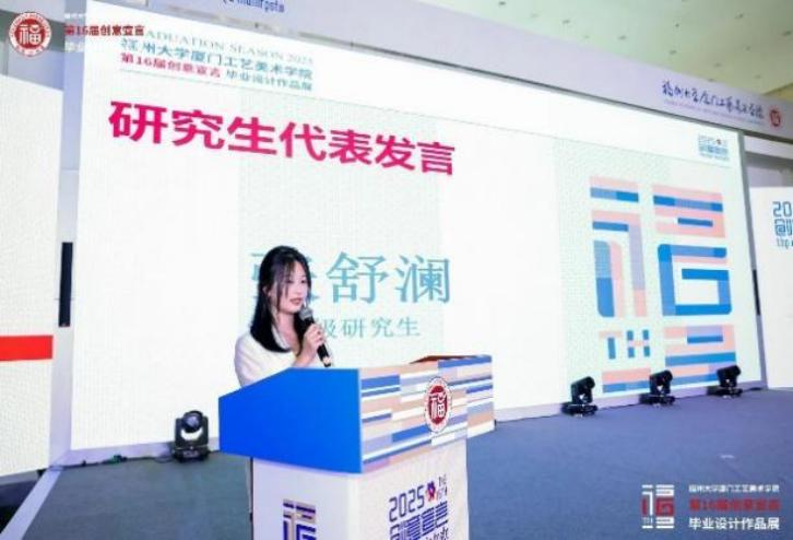 特步集团人才中心负责人刘竞博对学院毕业生的整体素质和学院人才培养 质量给予高度评价,并欢迎更多优秀学子加入企业。毕业生代表陶金钡(2021 级本科生)、张舒澜(2022 级研究生)也分享了在校期间学习与创作的体会与感悟。