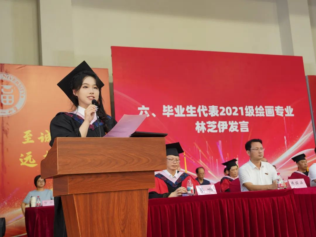 毕业生代表2021级绘画专业林芝伊上台发言,她深情回忆校园生活,感恩师长教诲,感谢同窗的帮助,满怀信心展望未来的艺术道路。