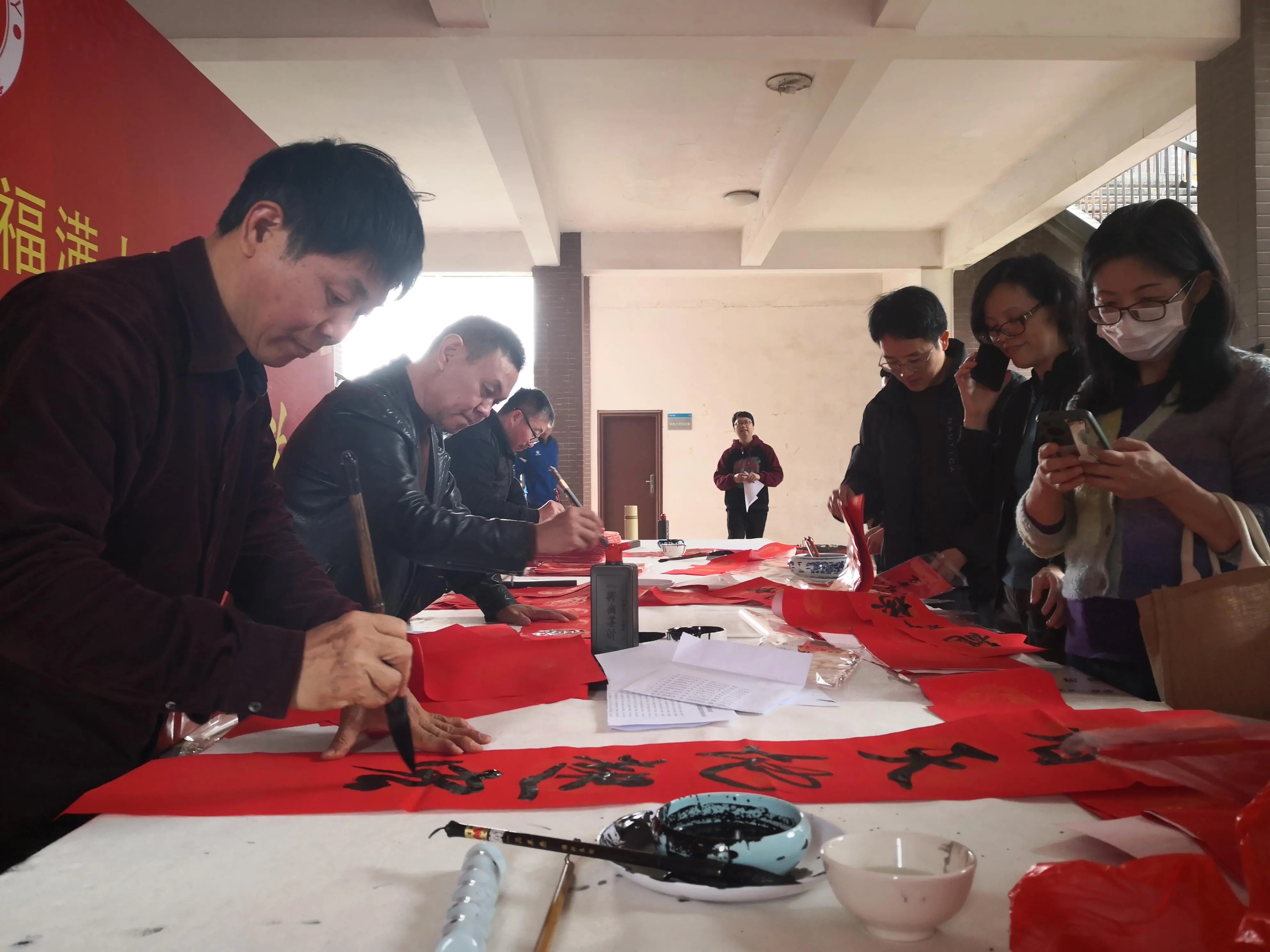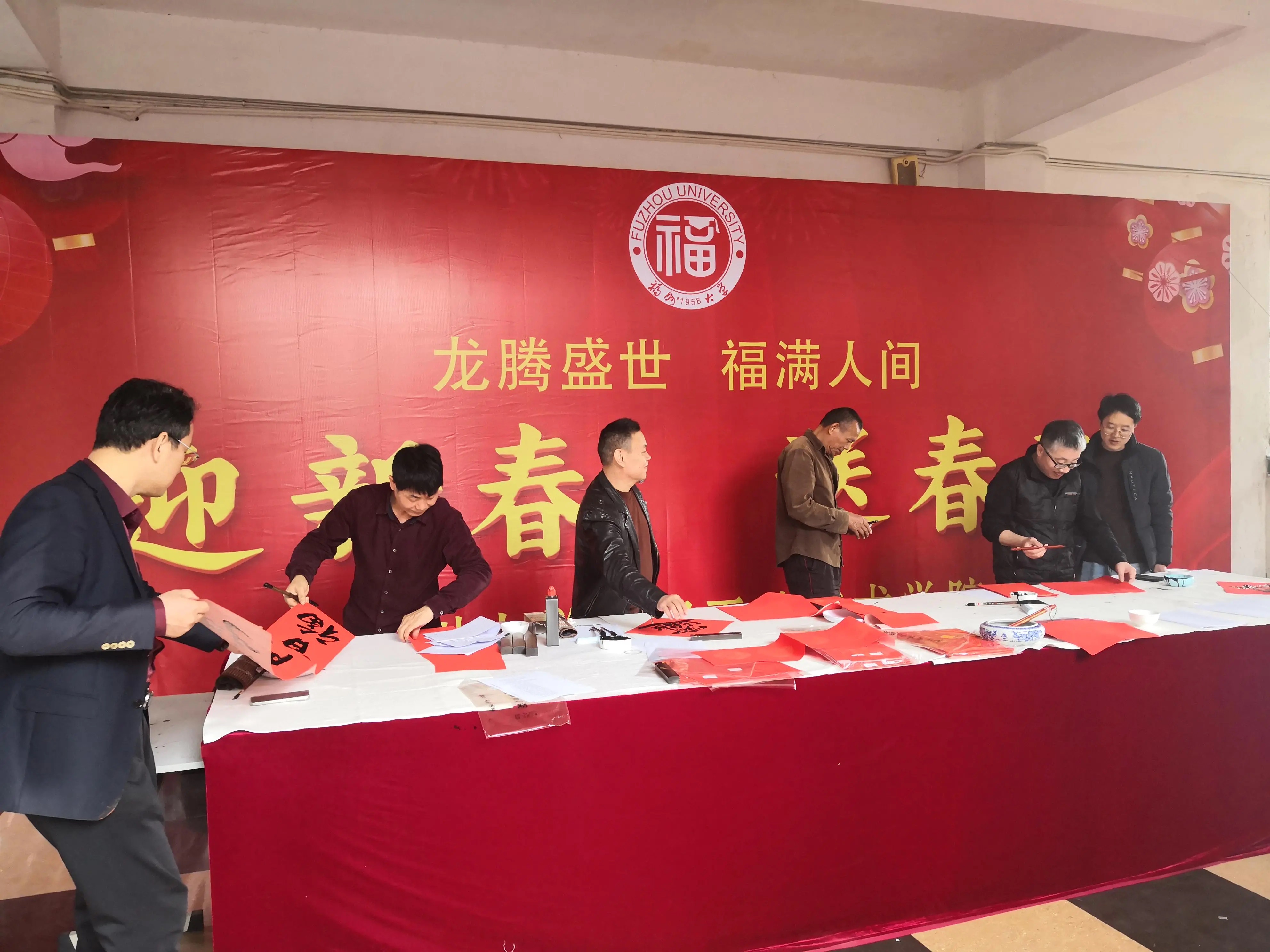 本次活动邀请了张瑞敏老师、陈思平老师徐保亮老师、陈振兴老师及福建大地书画院院长苏建党先生,挥毫拨墨,抚纸、蘸墨、运锋,鲜艳柔和的中国红、隽秀流畅的笔划、湿润闪亮的墨迹、寄托着美好愿望的词句,自腕下徐徐展现。一副副寓意吉祥的春联,充满浓浓的年味,寄托了美院人在新的一年里对美好生活的祈福与向往,为龙年春节增添了喜庆祥和的节日气氛。