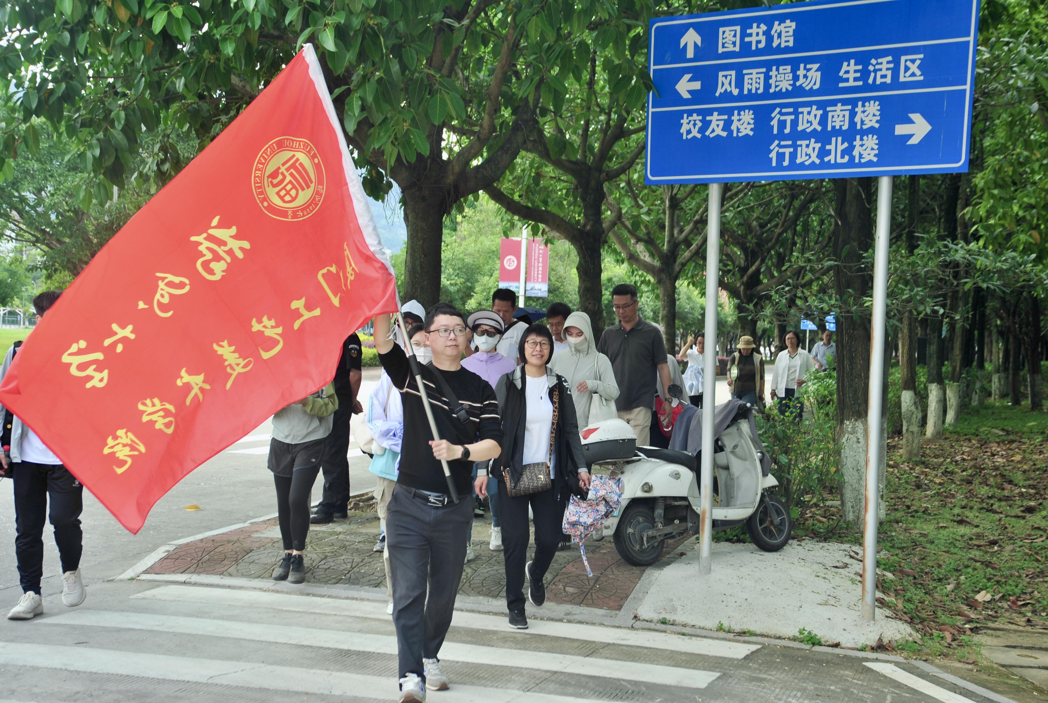 健步走活动在程玉敏主席的发令声下正式开启。教职工们神采奕奕,步伐矫健,从操场出发,途径校团委、方境桥、行政南楼、火山地质公园遗址(梅园)、福友阁、湖边栈道、校友楼、行政北楼、百竹园、雕塑园、同心林等十多处校园主景致,最终回到第一田径场举行趣味运动会。