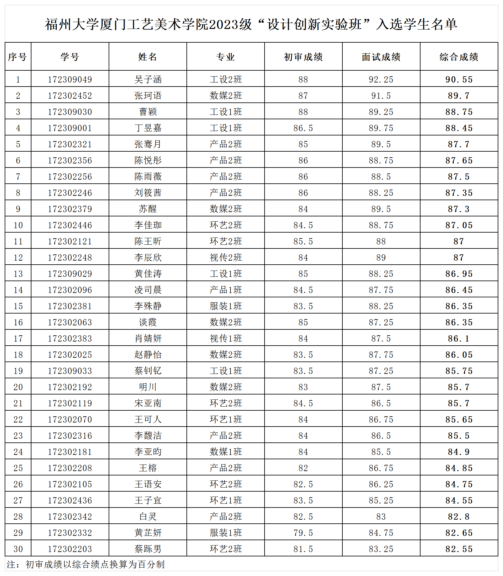 2023级“设计创新实验班”招生简章》文件规定,经学生个人申请、学院初审、专家面试考核等环节,研究确定2023级“设计创新实验班”学生30人,现将入选学生名单予以公示,公示时间:2024年10月23日至10月29日,在此期间若对上述名单有异议,请实名(姓名、联系方式)给予反映。联系方式:0592-3753779(学院纪检):邮箱:[email protected]