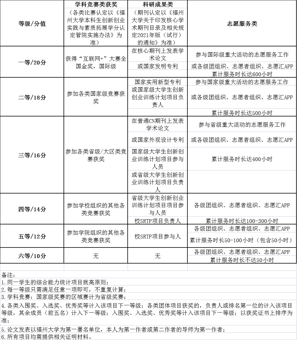 综合能力成绩(百分制)=参军入伍服兵役的单项综合能力成绩(满分20分)+参加志愿服务的单项综合能力成绩(满分20分)+到国际组织实习的单项综合能力成绩(满分20分)+科研成果的单项综合能力成绩(满分20分)+竞赛获奖的单项综合能力成绩(满分20分)。其中,如有参军入伍服兵役或到国际组织实习的经历,单项综合能力成绩即为单项满分20分,如果没有则为10分。其他项目根据成果级别计算: