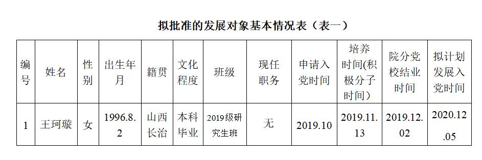 为了加强对发展党员工作的民主监督,确保发展新党员的质量,现将入党积极分子王珂璇同志的有关情况进行公示(详见《拟批准的发展对象基本情况表》),公示期10月19日至10月25日止。有异议者,可向学院党委反映。