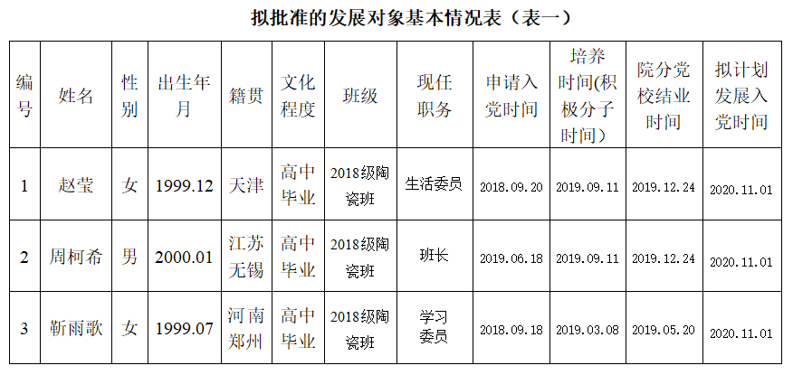 为了加强对发展党员工作的民主监督,确保发展新党员的质量,现将入党积极分子赵莹等3位同志的有关情况进行公示(详见《拟批准的发展对象基本情况表》),公示期10月19日至10月25日止。有异议者,可向学院党委反映。