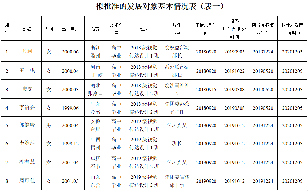 为了加强对发展党员工作的民主监督,确保发展新党员的质量,现将入党积极分子蓝轲等8位同志的有关情况进行公示(详见《拟批准的发展对象基本情况表》),公示期10月19日至10月25日止。有异议者,可向学院党委反映。
