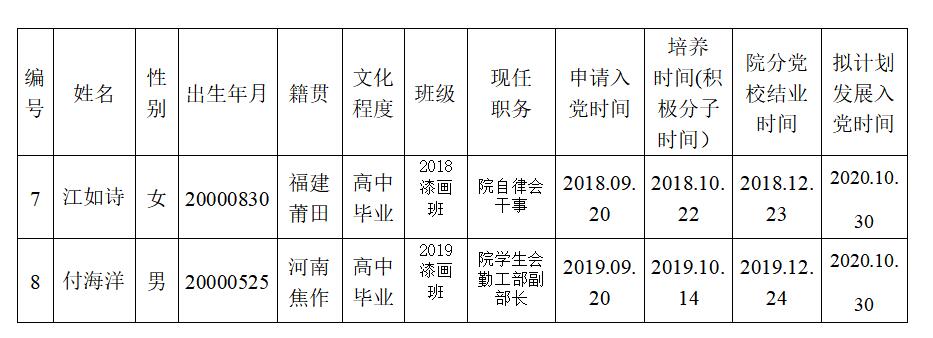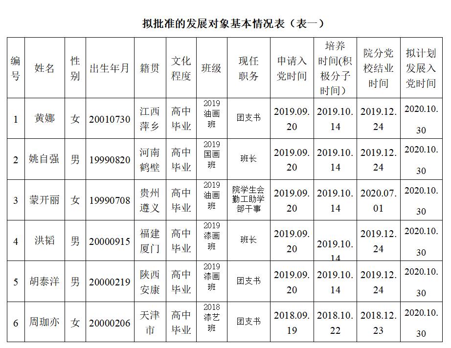 为了加强对发展党员工作的民主监督,确保发展新党员的质量,现将入党积极分子黄娜等8位同志的有关情况进行公示(详见《拟批准的发展对象基本情况表》),公示期10月19日至10月25日止。有异议者,可向学院党委反映。