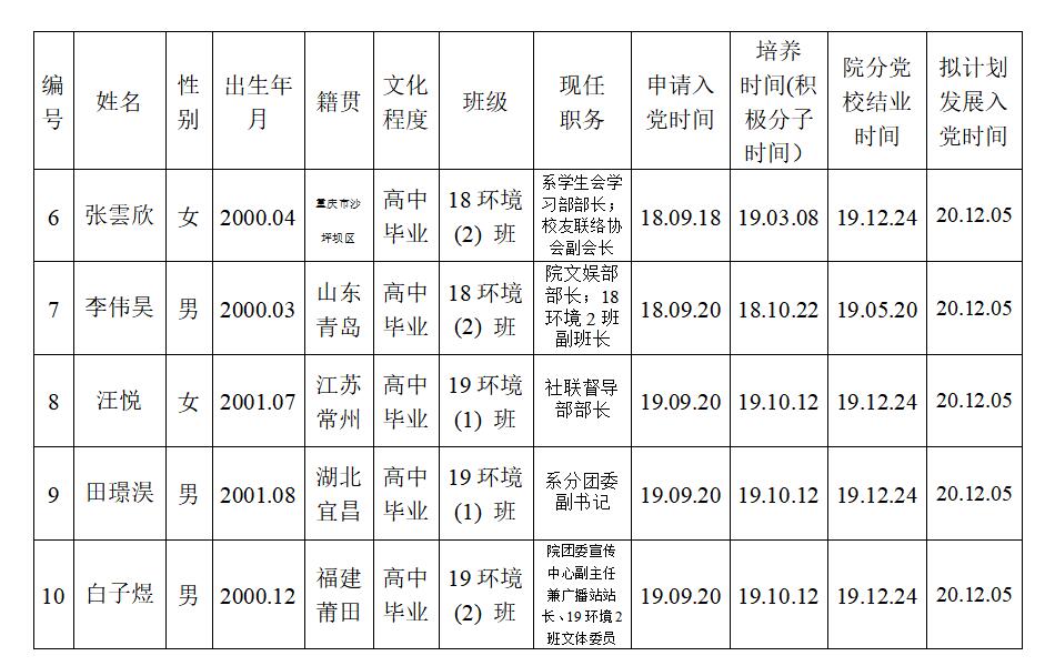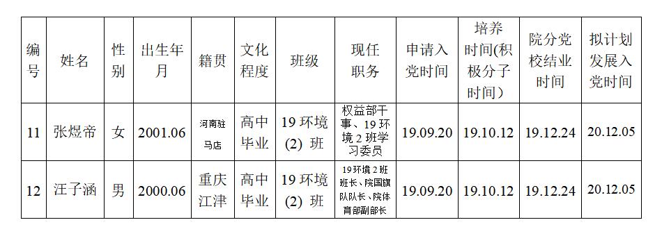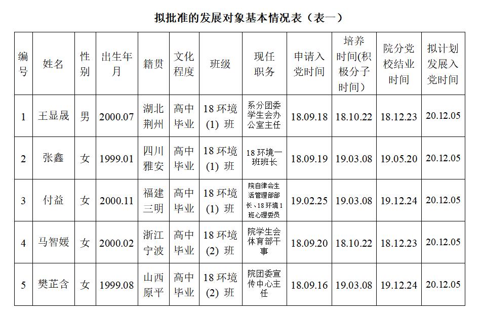 为了加强对发展党员工作的民主监督,确保发展新党员的质量,现将入党积极分子王显晟等12位同志的有关情况进行公示(详见《拟批准的发展对象基本情况表》),公示期10月19日至10月25日止。有异议者,可向学院党委反映。