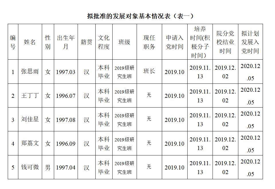 为了加强对发展党员工作的民主监督,确保发展新党员的质量,现将入党积极分子张思雨等5位同志的有关情况进行公示(详见《拟批准的发展对象基本情况表》),公示期10月19日至10月25日止。有异议者,可向学院党委反映。