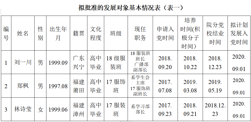 为了加强对发展党员工作的民主监督,确保发展新党员的质量,现将入党积极分子刘一川等三位同志的有关情况进行公示(详见《拟批准的发展对象基本情况表》),公示期6月8日至6月12日止。有异议者,可向学院党委反映。