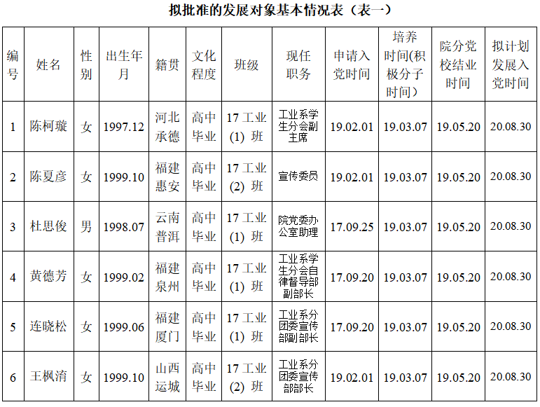 为了加强对发展党员工作的民主监督,确保发展新党员的质量,现将入党积极分子曾沁晗等12位同志的有关情况进行公示(详见《拟批准的发展对象基本情况表》),公示期6月6日至6月12日止。有异议者,可向学院党委反映。