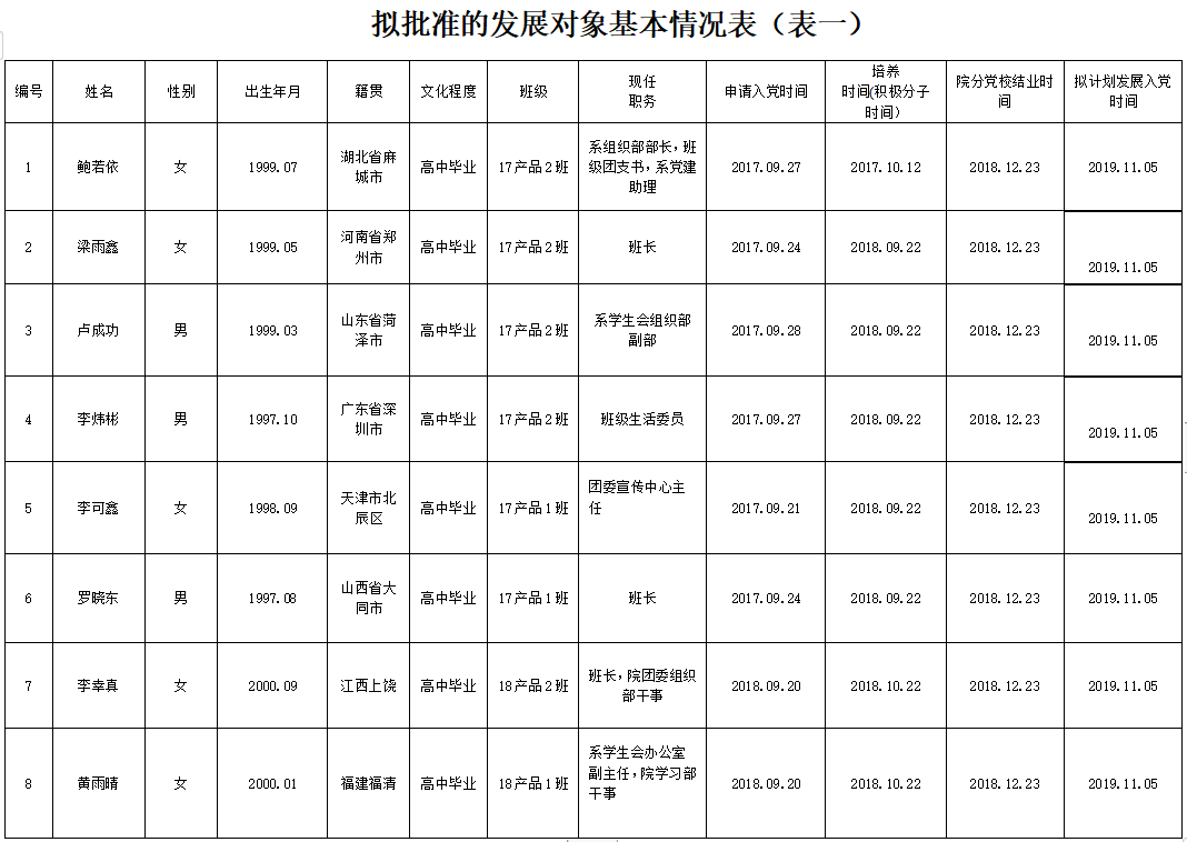 为了加强对发展党员工作的民主监督,确保发展新党员的质量,现将入党积极分子鲍若依等8位同志的有关情况进行公示(详见《拟批准的发展对象基本情况表》),公示期10月15日至10月21日止。有异议者,可向学院党委反映。