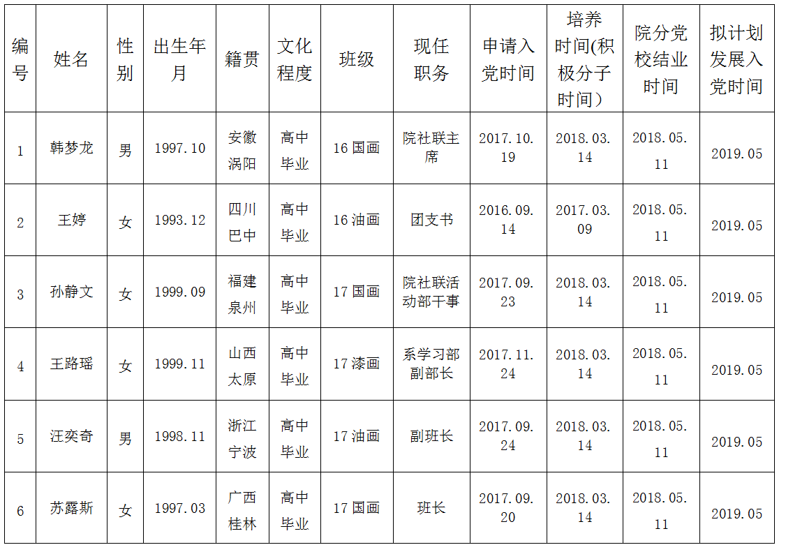 关于拟批准韩梦龙等9位同志为党的发展对象的公示书