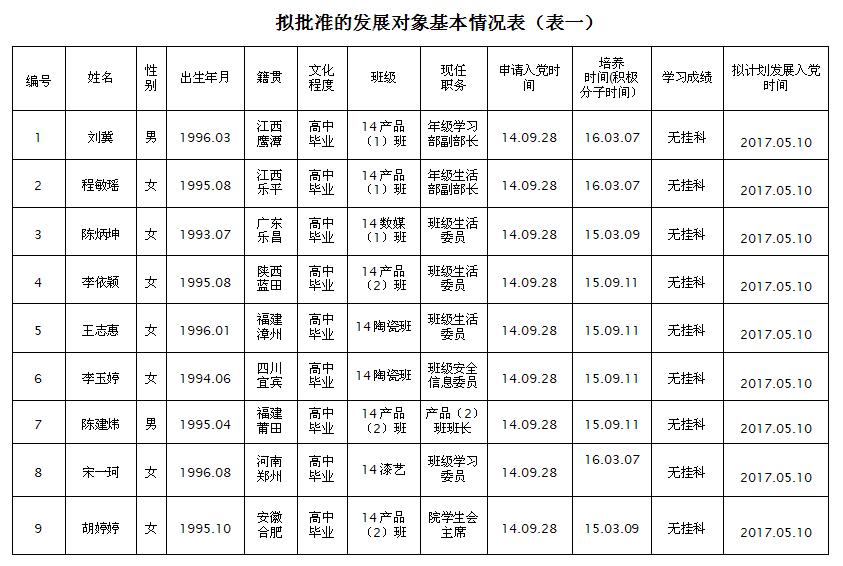 关于拟批准陈建炜等10位同志为党的发展对象的公示书